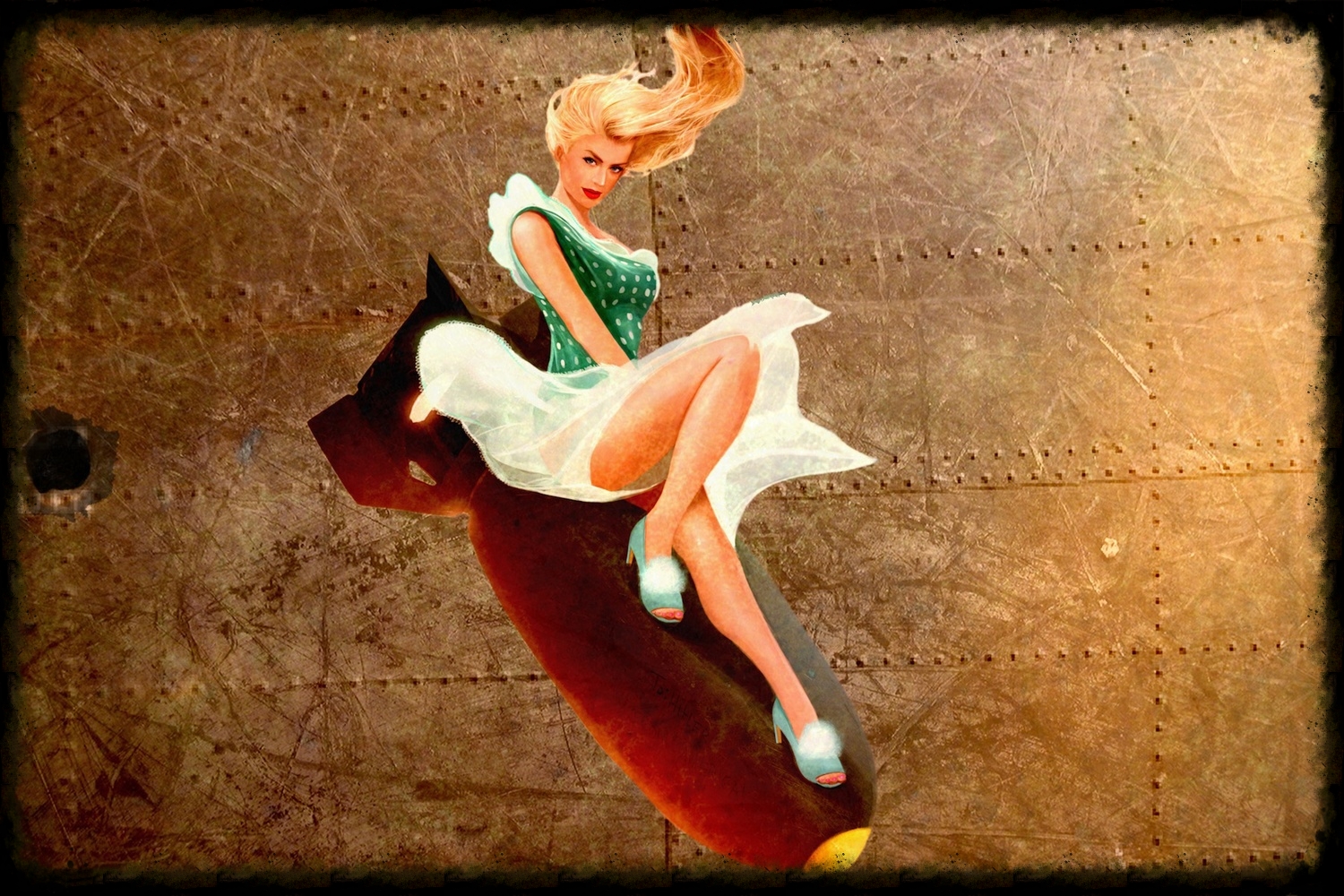 To sell the idea to his Squadron Commander, Danny's painting Rose on a large canvas in front of his B24. Beyond it scores of B24s can be seen lined up on the tarmac.